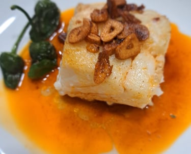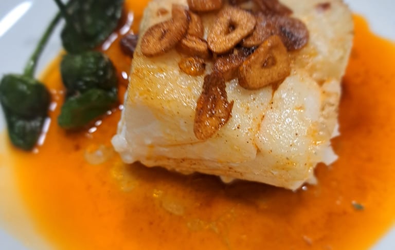 "...Preparado con la más alta calidad de lomo de bacalao, este plato resalta por su textura jugosa y delicada, logrando una combinación perfecta de frescura marina y robustos sabores mediterráneos. La ajada, una salsa tradicional elaborada con ajo y aceite de oliva, envuelve cada bocado en un bouquet de aromas irresistibles, realzando la riqueza natural del bacalao."